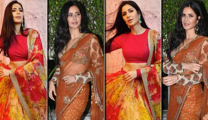 Katrina Kaif wore this Sabyasachi saree yesterday for the promotions of her upcoming movie and stole the present along with her blingy saree. The wonder selected a burnt orange colored saree with a round floral sequined sample that had a multi-coloured gota patti on the border together with the gold-sequinned elaborations.