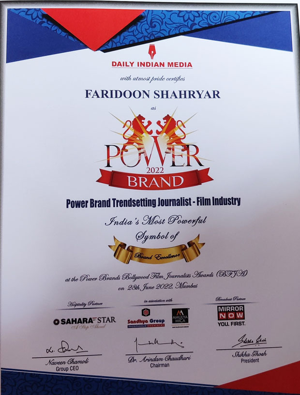 ‘Trendsetting Journalist award’ for Bollywood Hungama’s Faridoon Shahryar at Power Brand Awards : Bollywood News