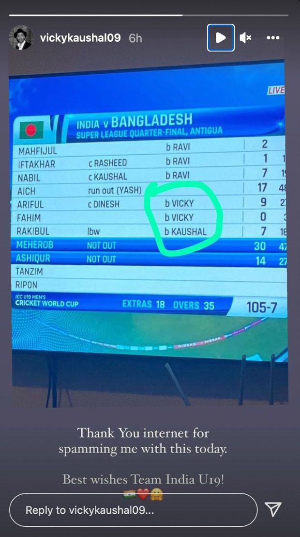 Bollywood star Vicky Kaushal typically shares photos and movies of himself and his private life on social media. On Sunday, the actor shared a meme that went viral on the Web lately. Indian U19 Cricket Crew performed in opposition to Bangladesh and whereas flashing the scoreboard on-line, coincidentally Vicky Kaushal’s title exhibits up on the display screen.